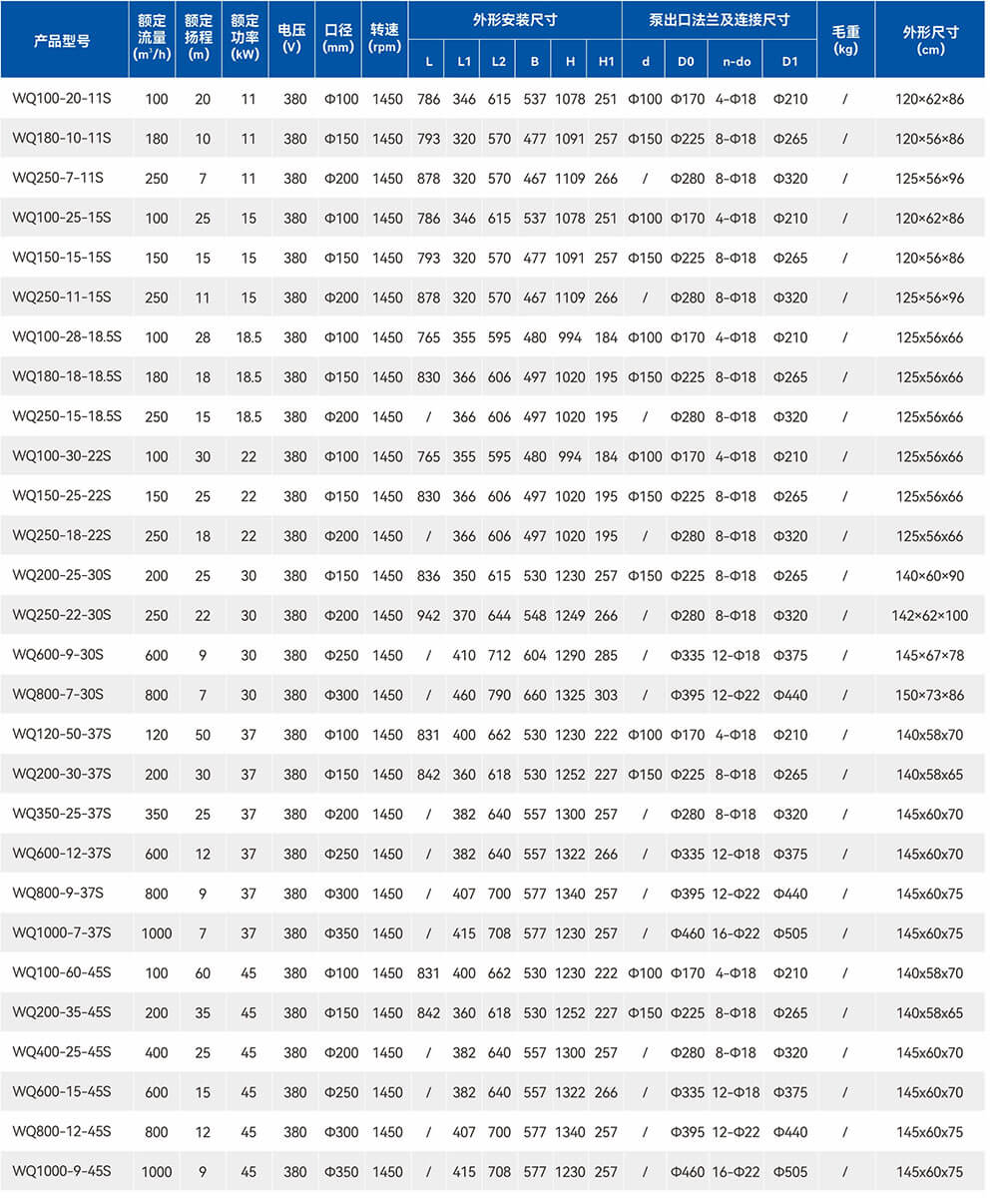 國標法蘭WQ-S全不銹鋼精密鑄造污水污物潛水電泵采用不銹鋼精密鑄造外殼,具有耐腐蝕、環(huán)保型、揚程高、流量大等特點。